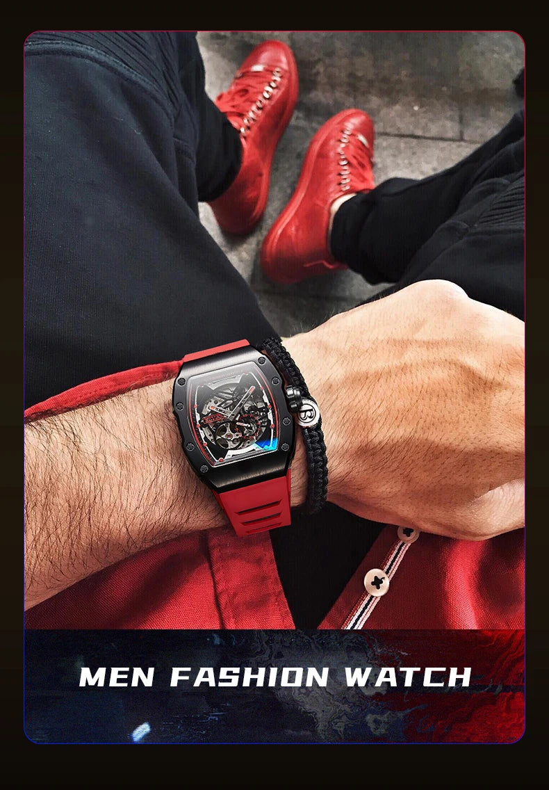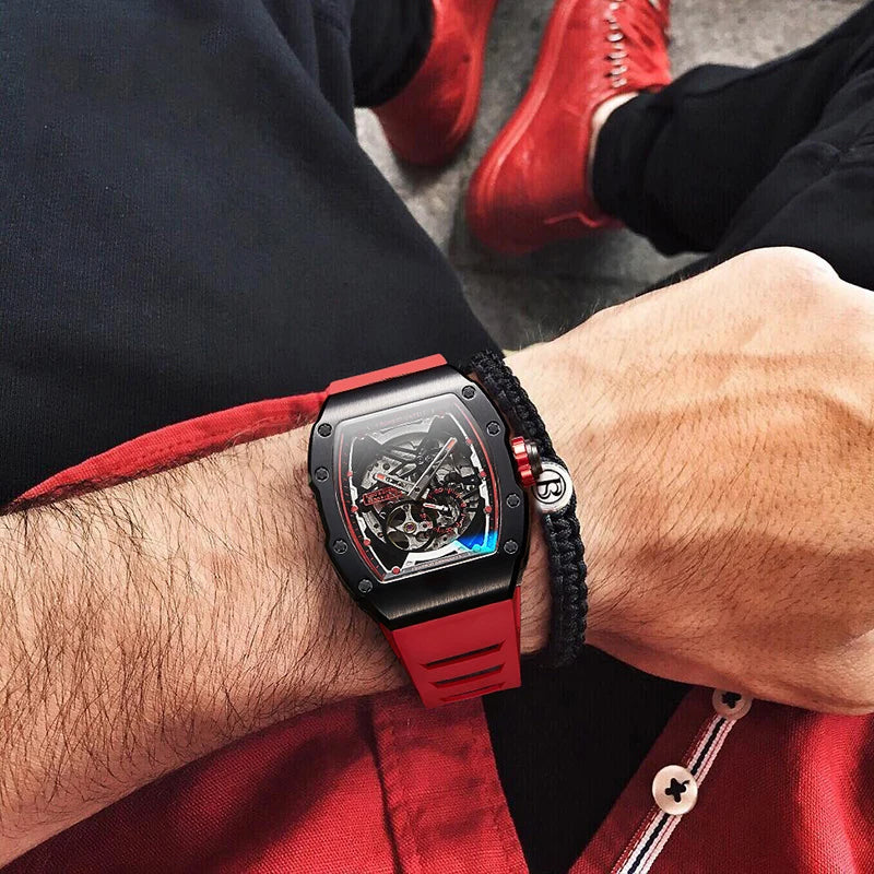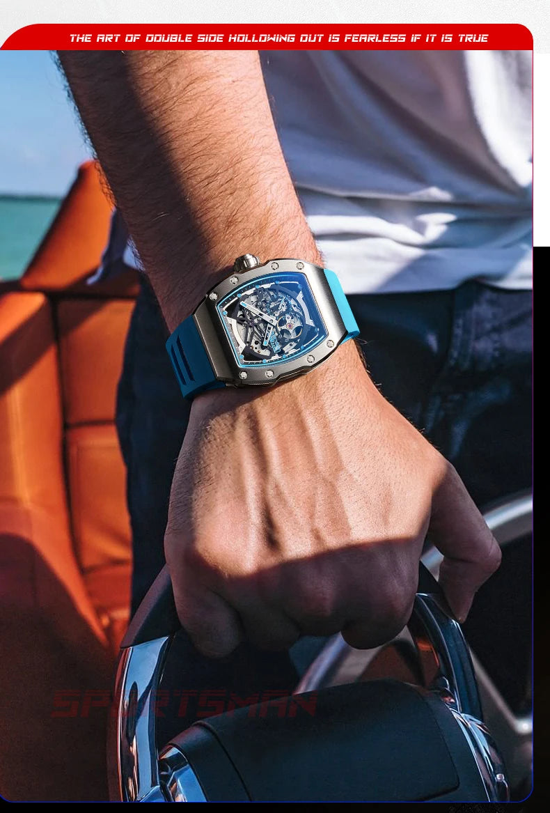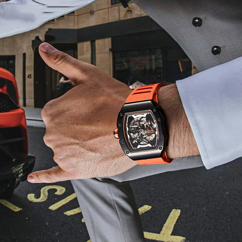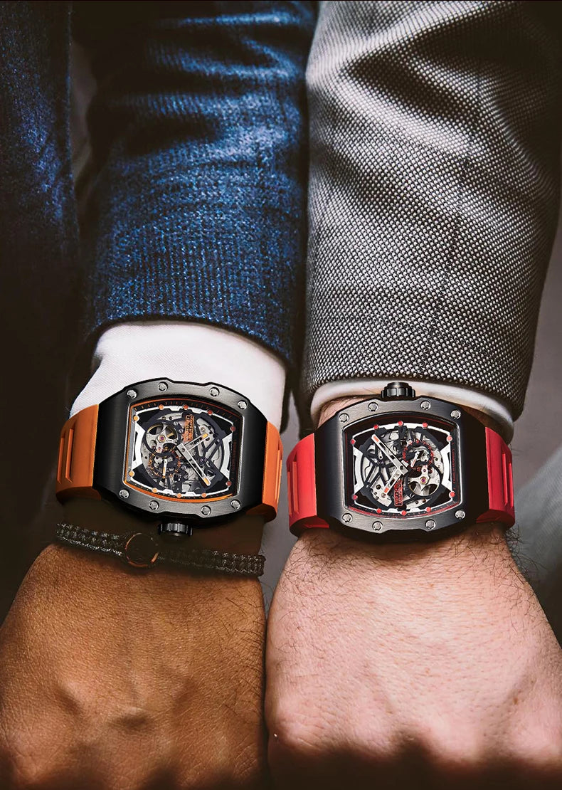 Com mostrador skeleton e acabamento agressivo, o 9901 exibe sua mecânica interna como se fosse parte de sua identidade — ideal para quem sabe que cada detalhe importa. 42-45 mm de diâmetro e 12 mm de espessura entregam presença sem desconforto. A pulseira de fluoro-rubber oferece versatilidade, robustez, e estilo esportivo com acabamento de luxo.
