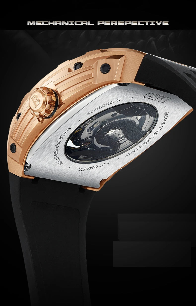 Eles estão próximos em visual ao BG5605 / BG5606 do tipo “fashion dragon barrel”, que trazem bezel decorativo, pulseira de borracha, e movimento automático, se diferenciando de modelos mais técnicos como os Ghost Speed ou Skeleton — aqui o apelo visual e a identidade temática têm papel central.