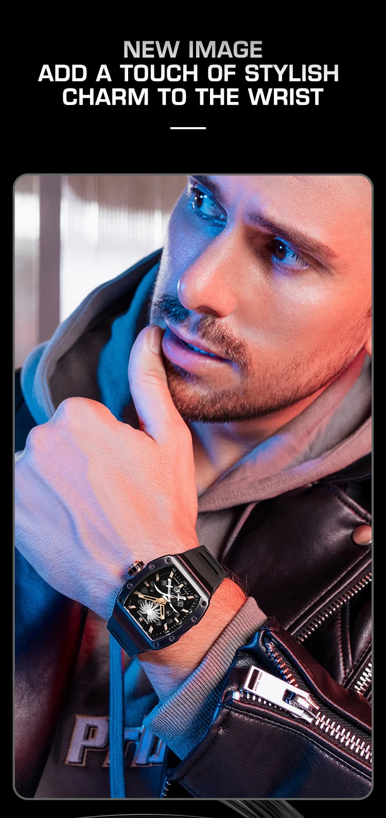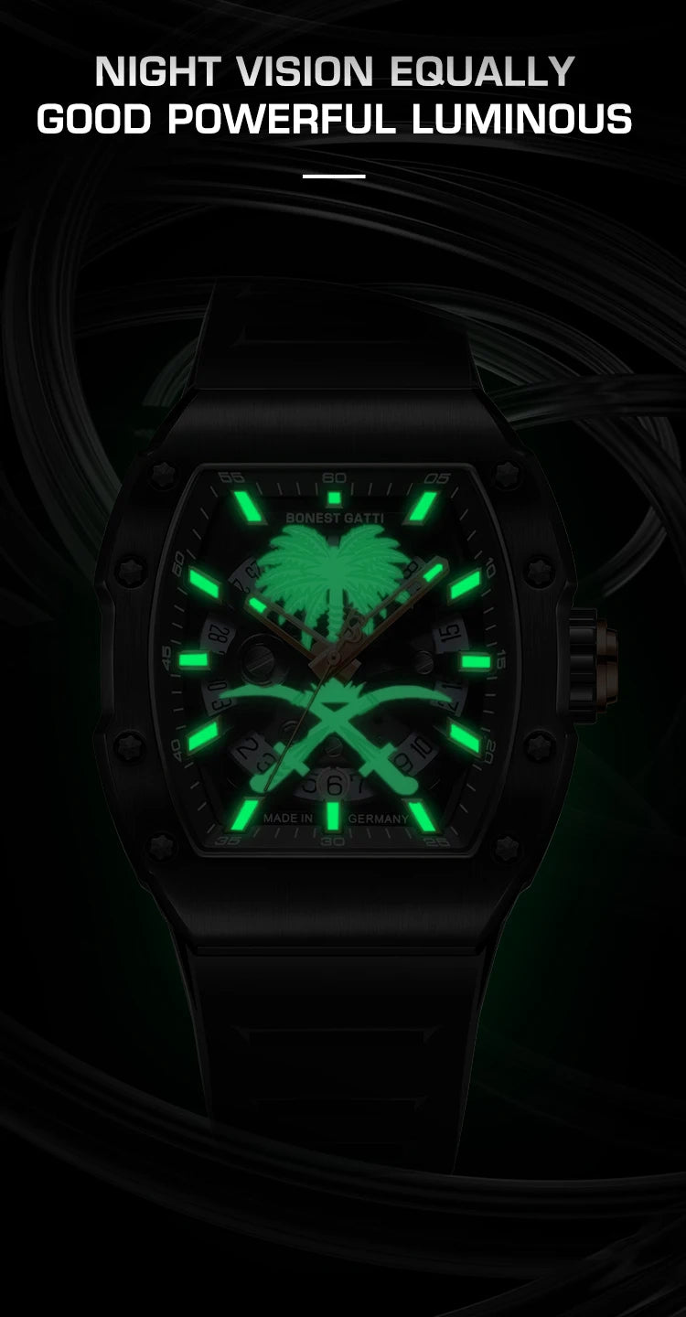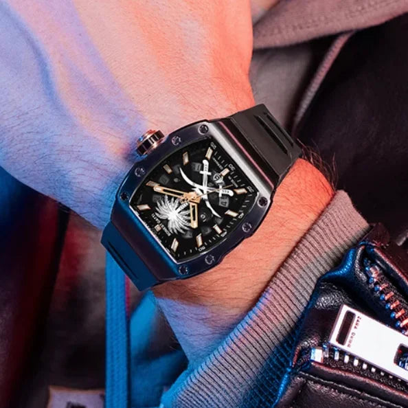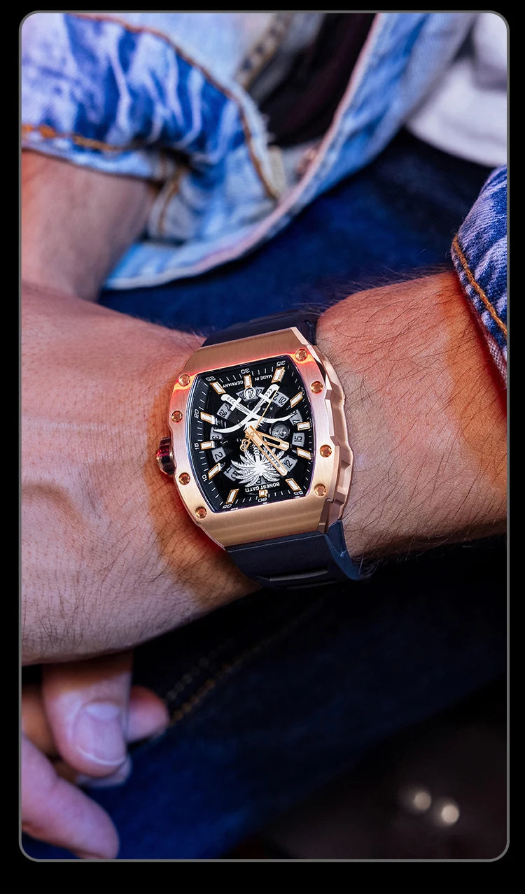 Com uma dimensão de ~45 mm, ele tem presença suficiente para ser notado, mas mantém o conforto e usabilidade graças à espessura controlada (~12 mm) e pulseira fluida. A estética tonneau reforça sua identidade moderna; o uso de materiais como aço sólido e vidro premium asseguram durabilidade.